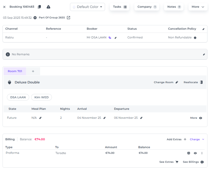 - Meal Plan: View or manage the meal plans for the booking (e.g., BB - Bed & Breakfast).