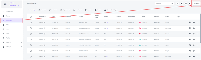- Choose Bookings from the main menu and find the reservation by using the filter: