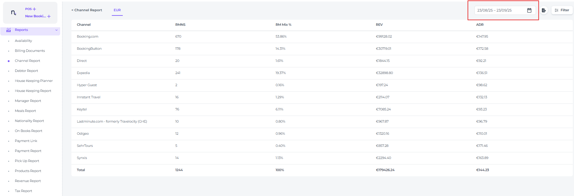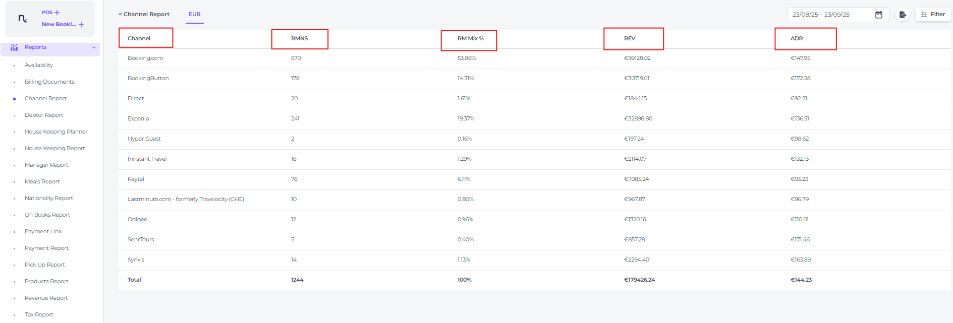 RM MIX% - Percentage of total room nights: Shows the share of bookings each channel represents.