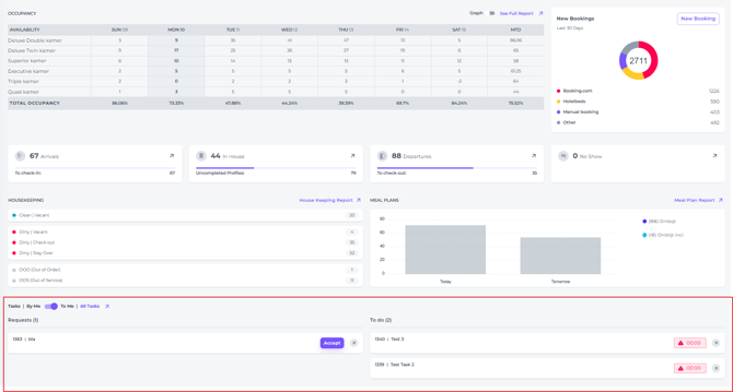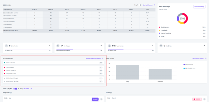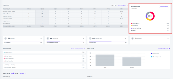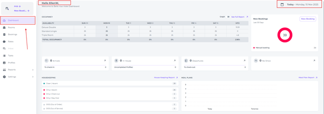 The Dashboard is the first page you will see after logging in to your PMS. Designed for quick insight, it provides a clear overview of your hotel’s current operational status at a glance. Whether you need up-to-date key figures for Front Office, Housekeeping, or F&B meal plans, the Dashboard delivers essential information—making it the ideal starting point for your day.