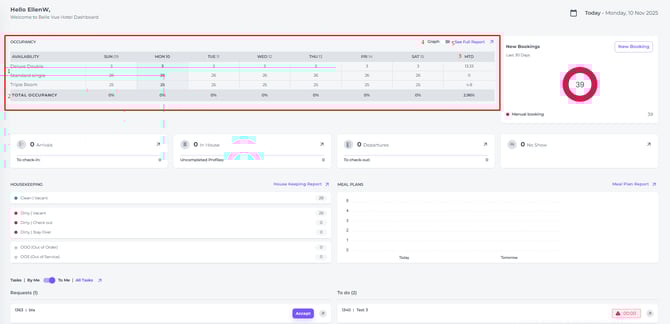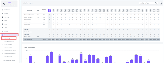 - MTD (Month to Date) - The availability of the room throughout the month (calculated by dividing the number of occupied rooms by the total number of rooms) and the average occupancy in percentages of the past month.