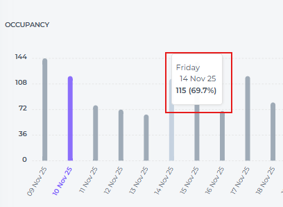 By hovering your cursor over the occupancy bars, you can view the exact number of rooms sold and the occupancy percentage for each specific day: