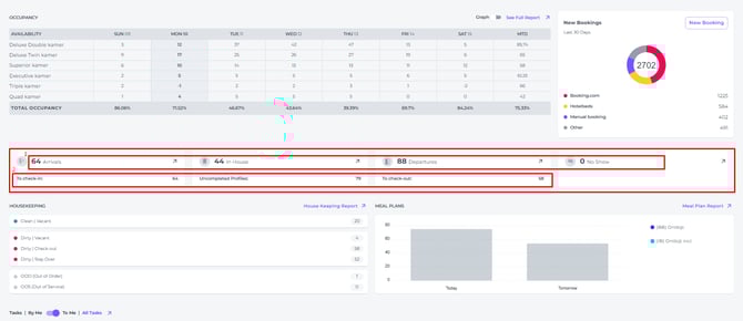 Shows you the current expected arrivals, in-house, departures and yesterday's no- shows.