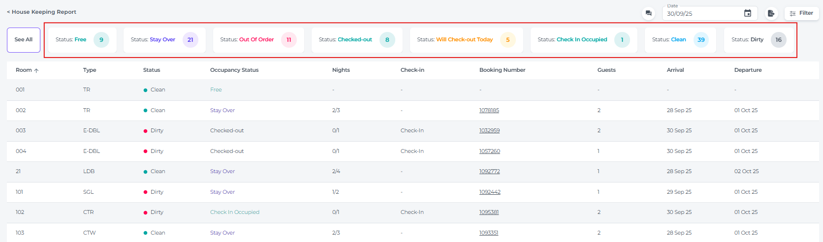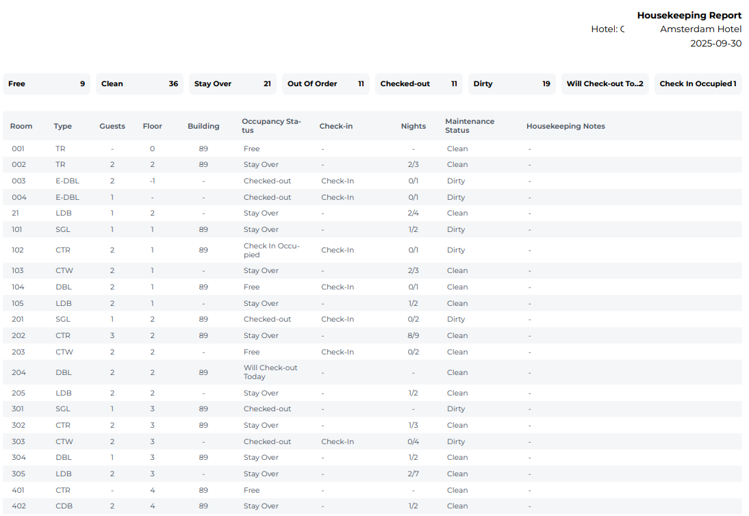 At the top of the report, you will find a summary of housekeeping statuses, showing how many rooms currently have each status.