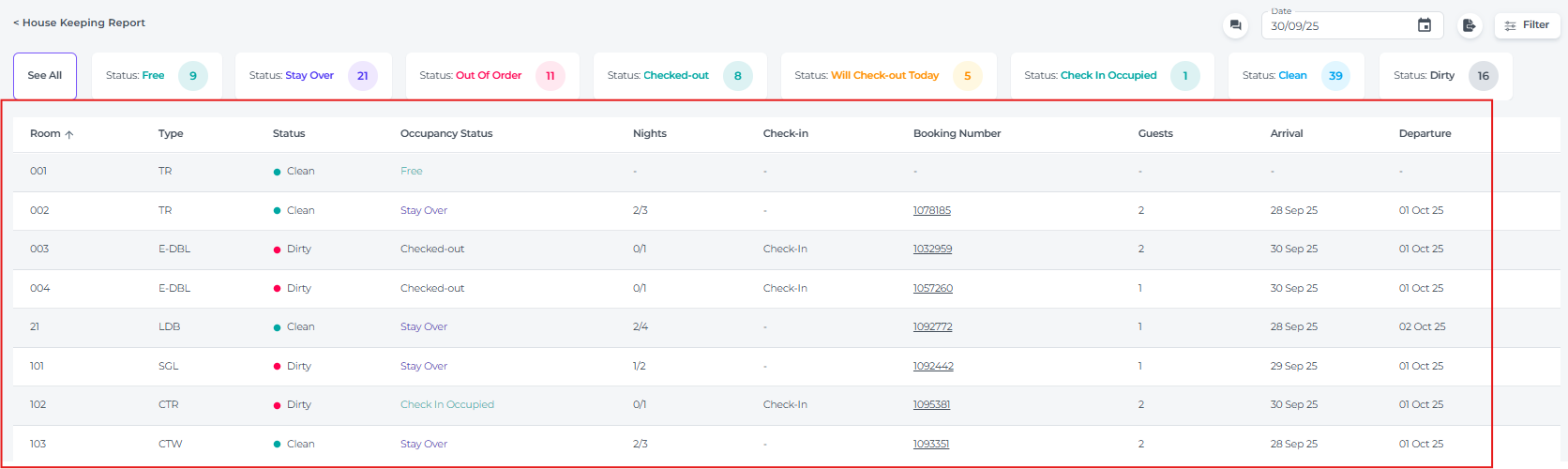 - Will Check-out Today - The number of rooms that still need to check out on the current date.