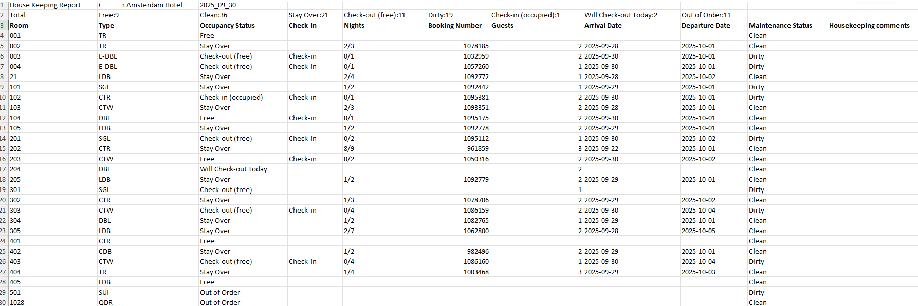 - Type - Indicates the category of the room, which is essential for housekeeping planning, as different room types may require varying cleaning times, amenities, or special attention to specific details.