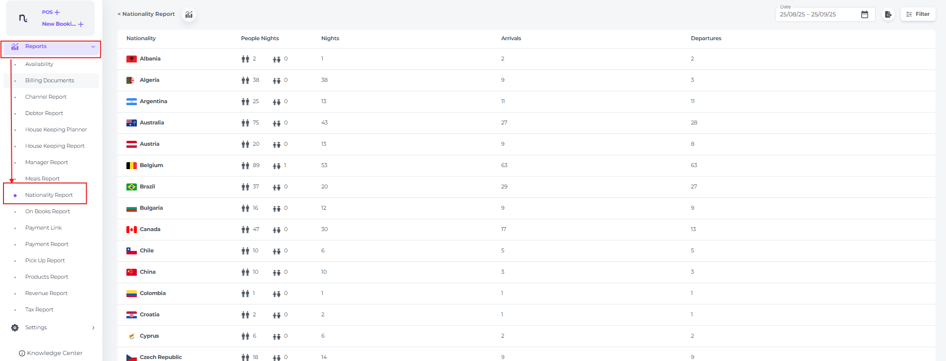 The Nationality Report provides clear insights into where your guests are coming from and their stay patterns. In certain countries, it is mandatory to submit this information to government authorities on a regular basis.