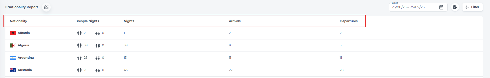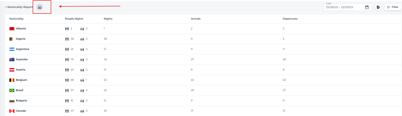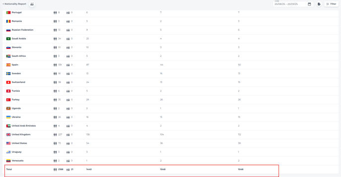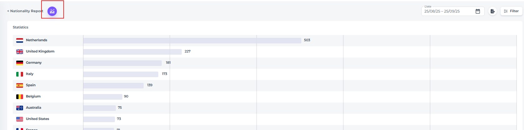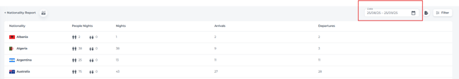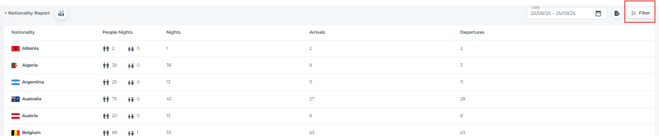 Click the Filter button allowing you to refine the report by specifying arrival and departure dates per nationality: