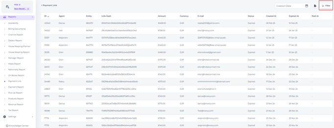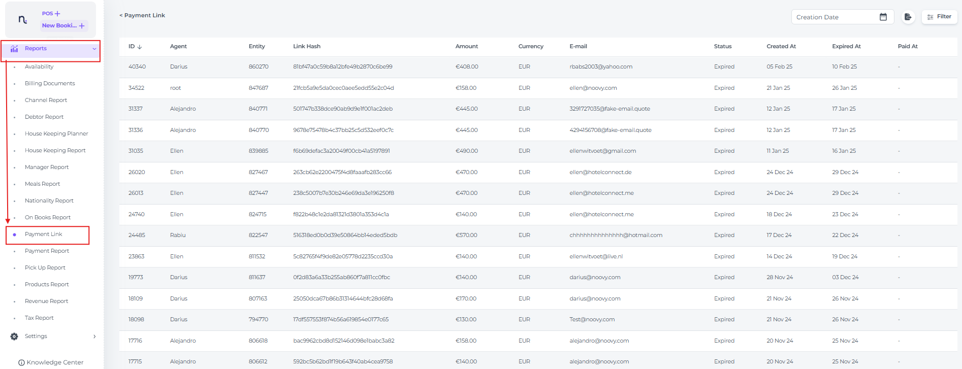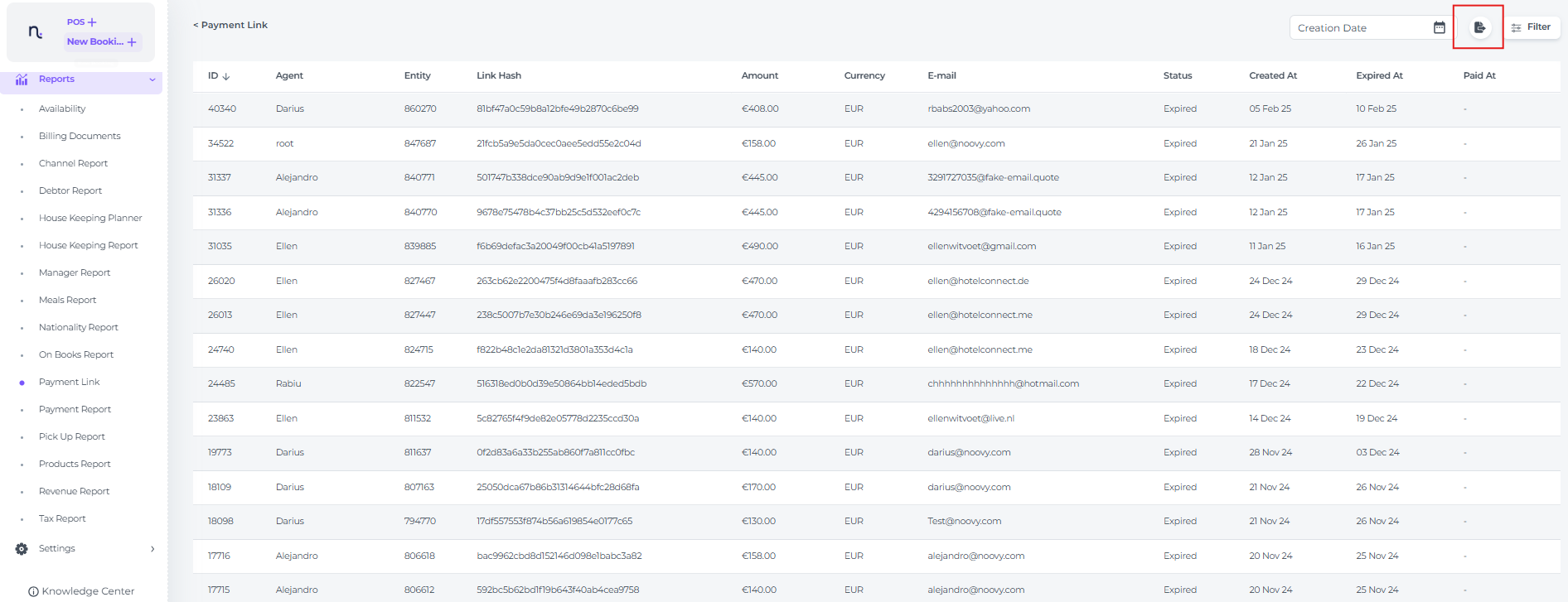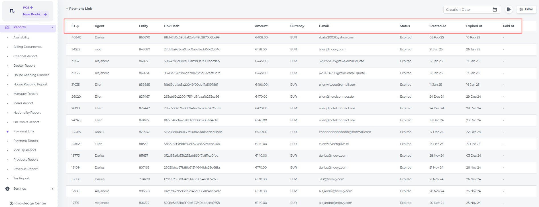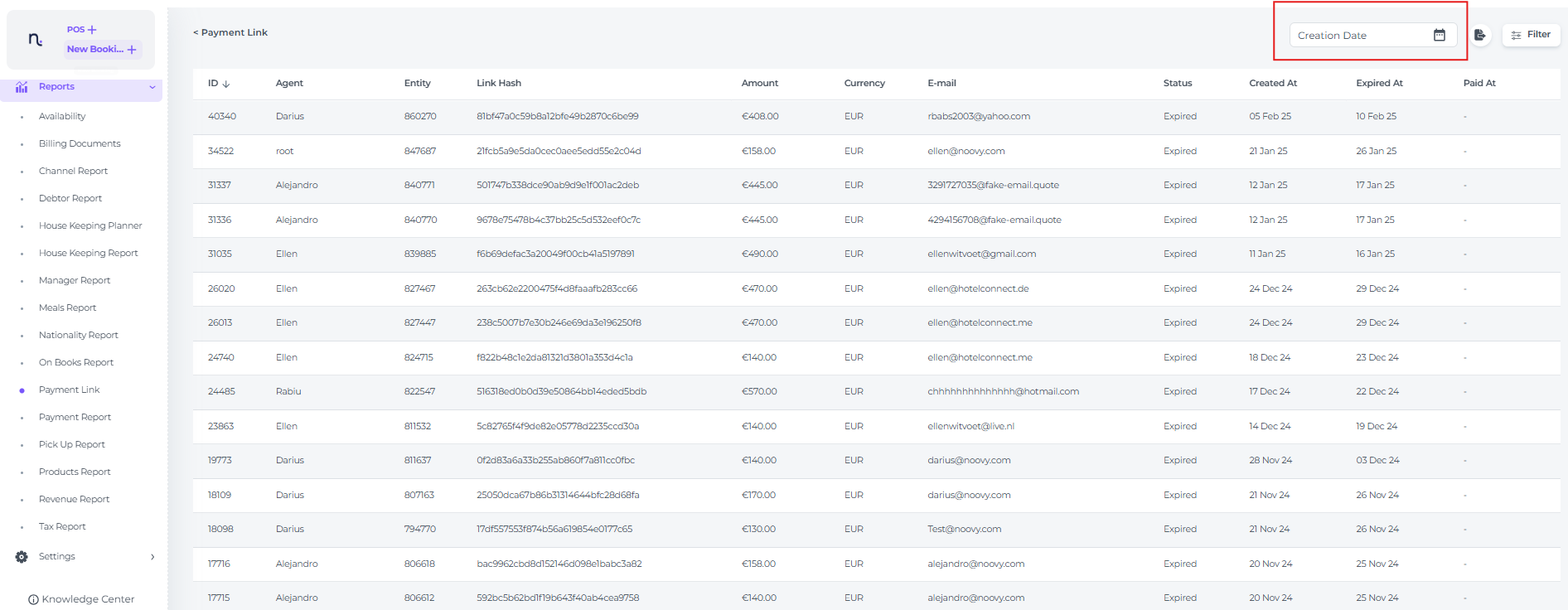 In the Creation Date field, select the desired date to view payment links generated on that specific day. If you leave this field blank, the report will display all payment links, with the most recently created appearing at the top:
