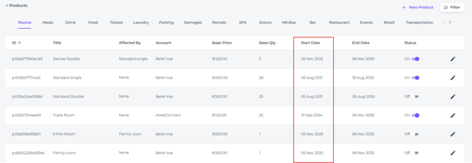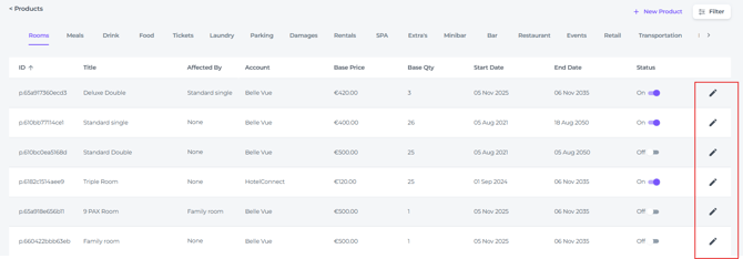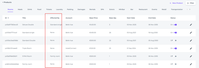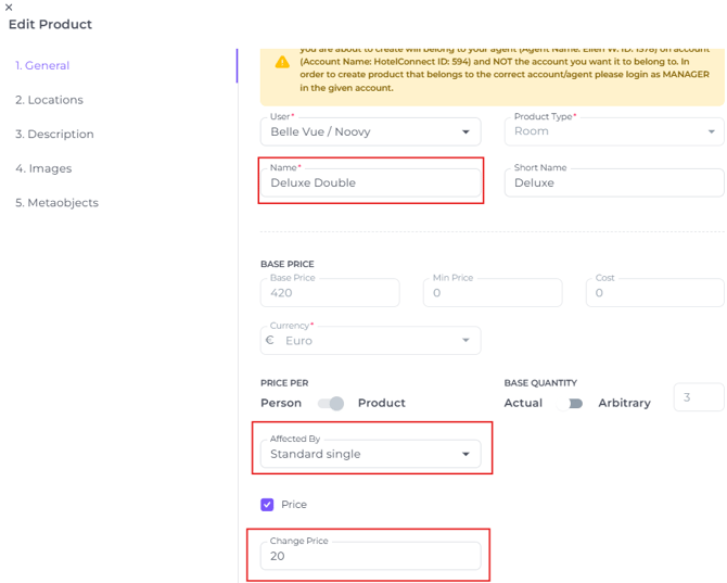 In the below screenshot you see that the Deluxe Double room Is affected by Standard Single by €20. so if Standard Single is set to 400 euro, The Double automatically becomes €420. In principle this can be done for any product: