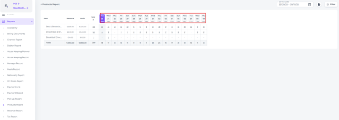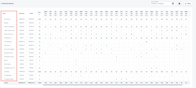 Click on the booking the product was booked on to amend or to identify who purchased each item, monitor any price adjustments, and check if an item was booked by a specific user. - The Filter allows you to refine your search: