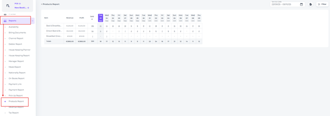 - The Products report can be found from the main menu under Reports: