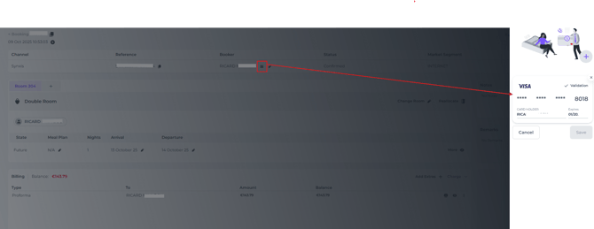 The card is linked to the reservation either automatically during the online booking process or manually added by a hotel team member: .
