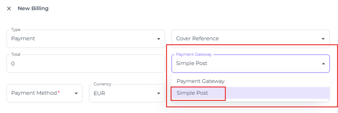 You will be prompted to specify the payment type. Although the field is labeled Payment Gateway, this is where you select Simple Post.
