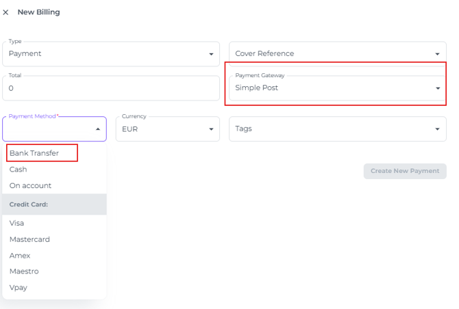 While uncommon, some guests may choose to settle their reservation by making a payment through a bank transfer. In this case you will need to create a Simple Post Bank Transfer payment: