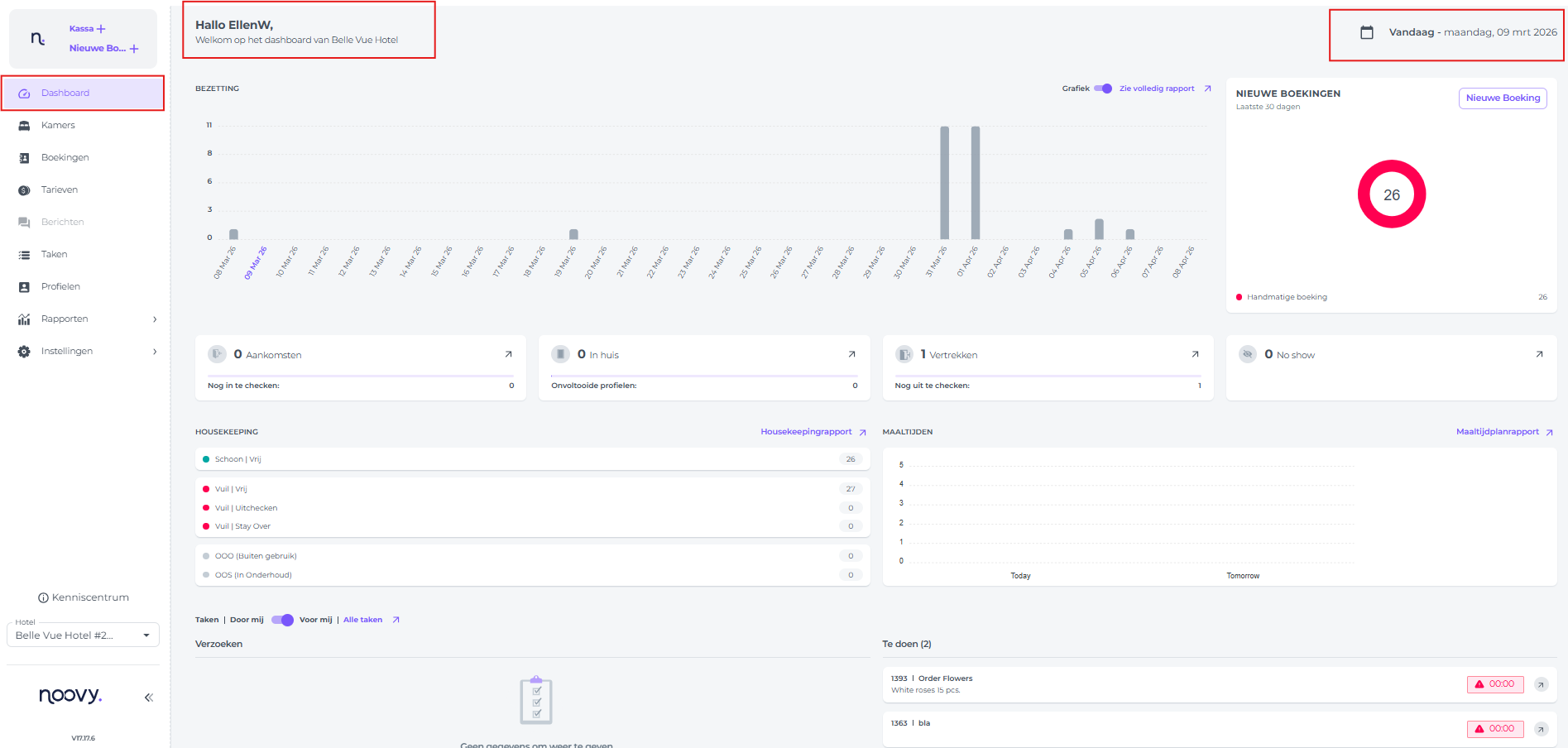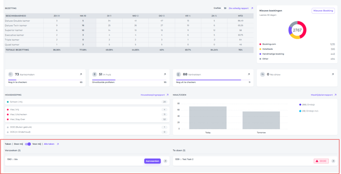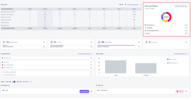Het Dashboard is de eerste pagina die je ziet nadat je bent ingelogd. Het is zo ontworpen dat het je in één oogopslag een duidelijk overzicht geeft van de operationele status van uw hotel. Of het nu gaat om informatie aangaande de Front Office, Housekeeping of F&B, het Dashboard biedt essentiële informatie en ieen goed startpunt voor je dag.