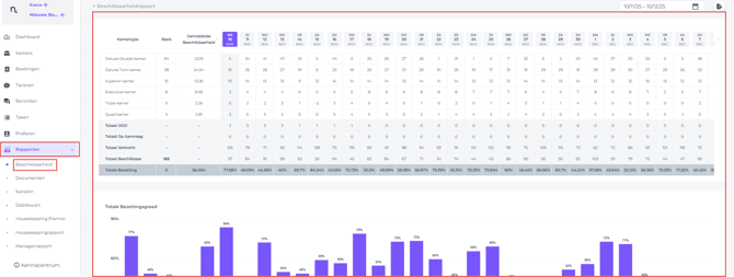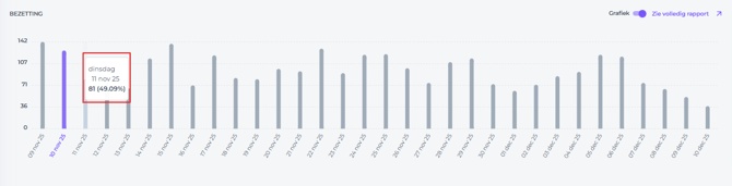 Door met de cursor over de bezettingsbalken te bewegen, kan je het exacte aantal verkochte kamers en het bezettingspercentage voor elke specifieke dag bekijken: