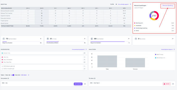 Toont het totale aantal boekingen dat de afgelopen 30 dagen is gemaakt, duidelijk gesegmenteerd op de meest gebruikte boekingskanalen, handmatige boekingen en andere bronnen.