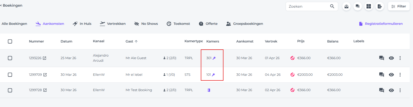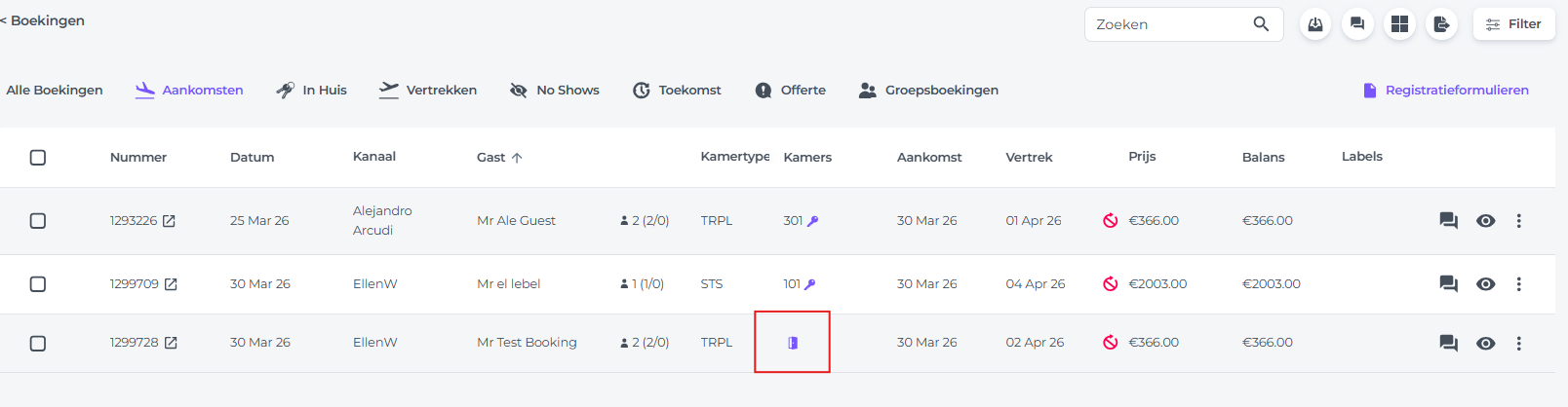 - Kies in het hoofdmenu de optie Boekingen en klik op het tabblad Aankomsten: