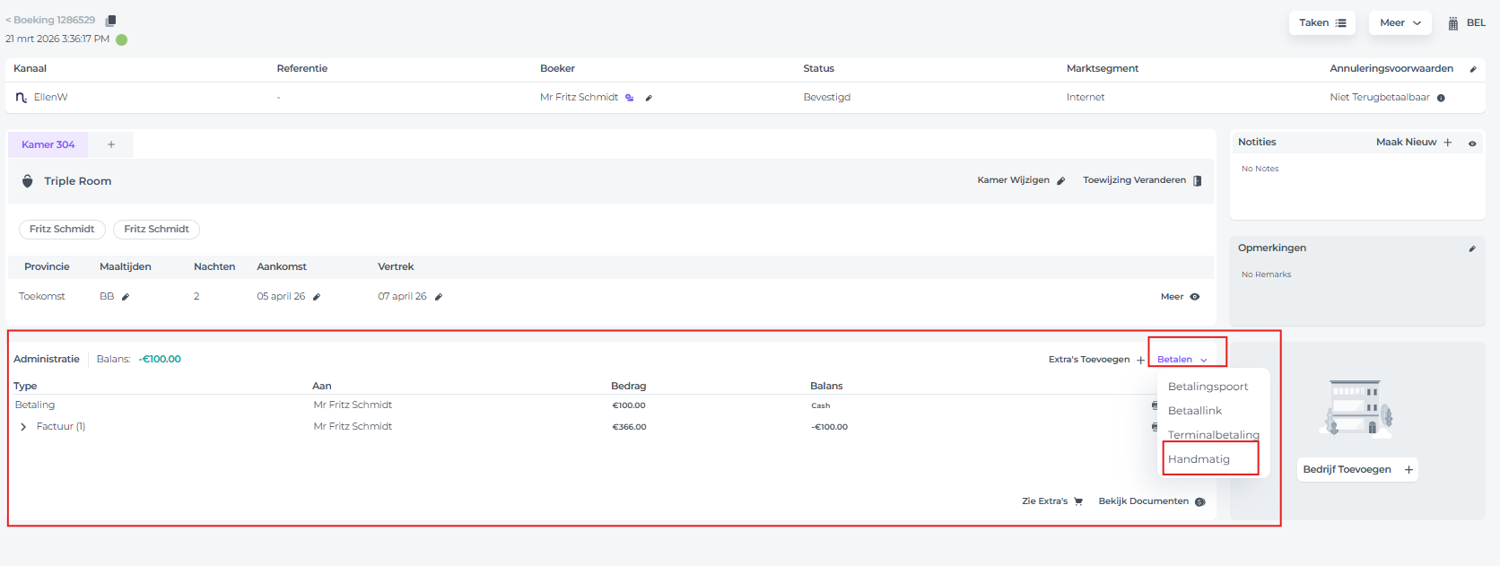 - Ga op de boekingspagina onder 'Administratie' naar Berekenen > Handmatig om een betaling aan te maken.