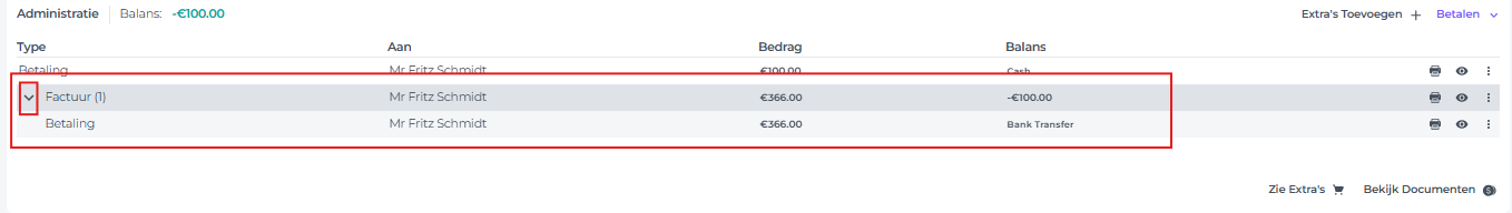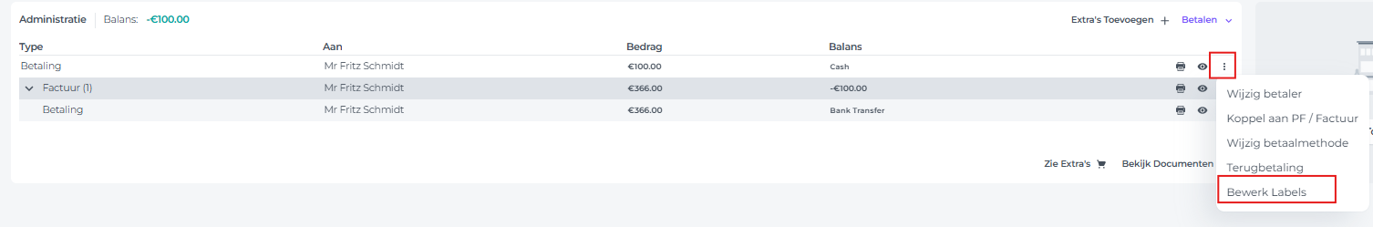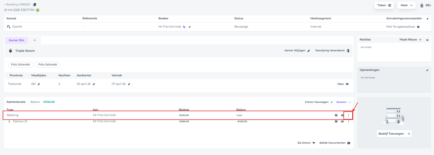 - Ga op de boekingspagina naar 'Administratie' en klik op de knop voor Meer acties (de drie puntjes) naast de betaling.