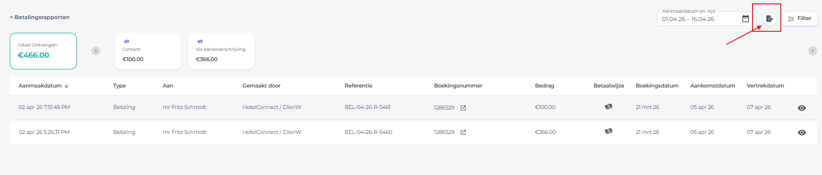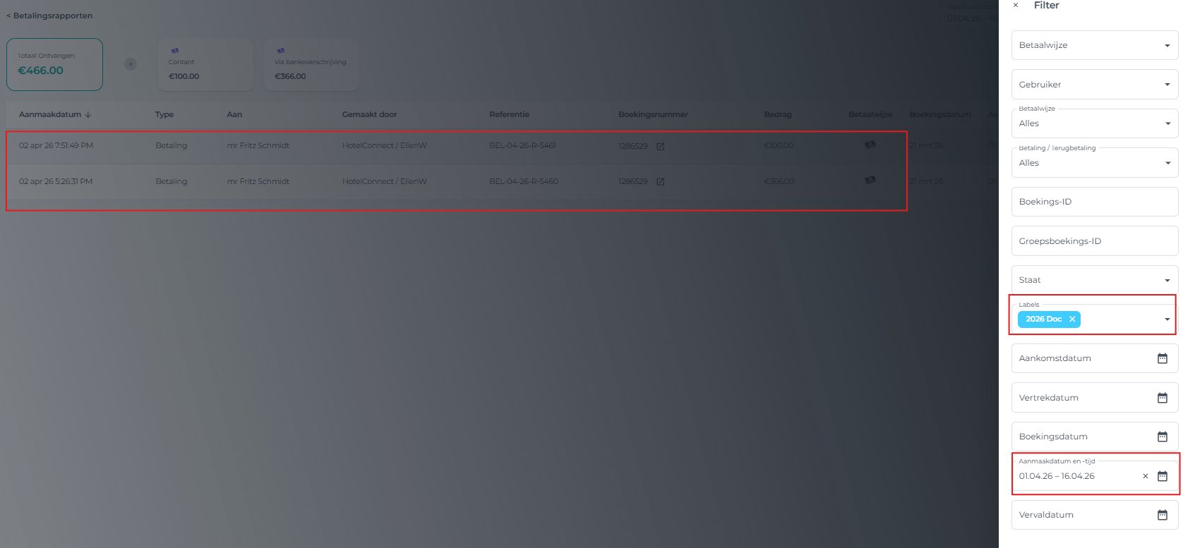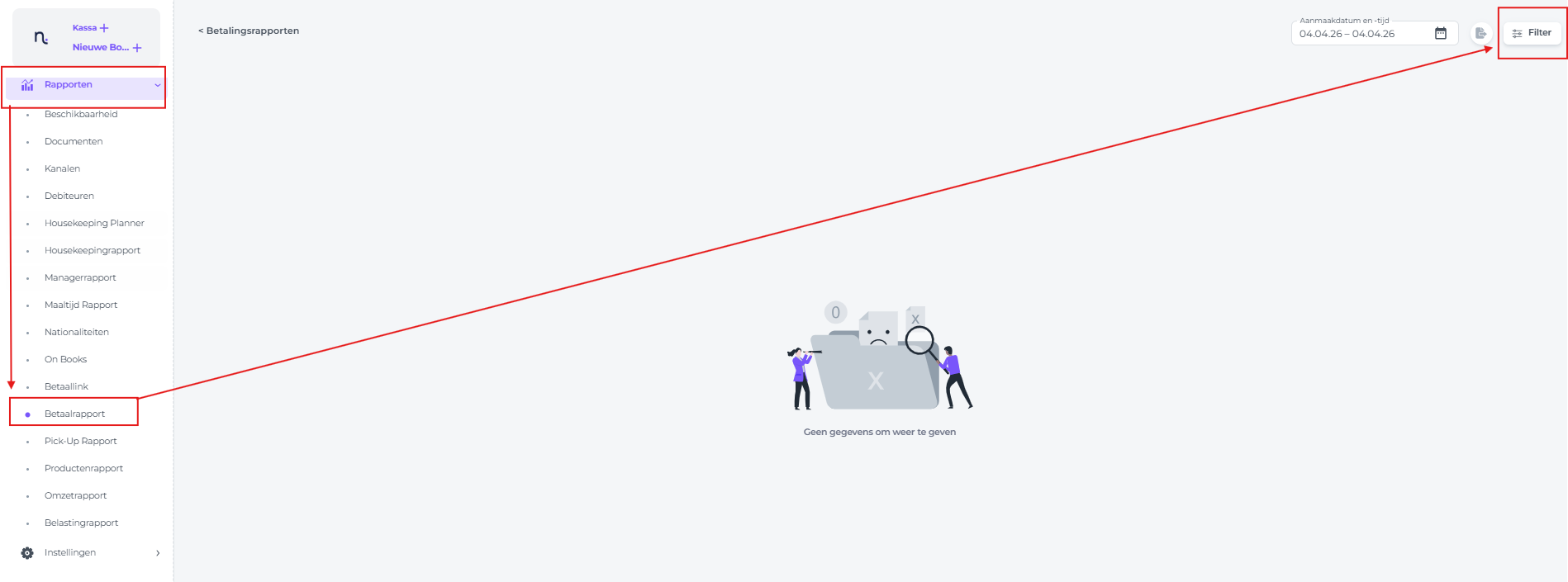 - Ga in het hoofdmenu naar Rapporten > Betalingsrapport en ga naar de filter: