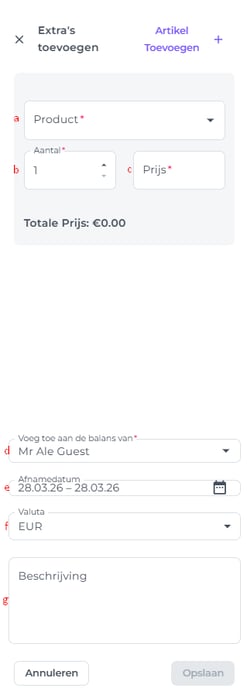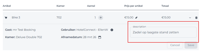 - Beschrijving: Voeg hier specifieke interne opmerkingen of notities toe die relevant zijn voor dit product. *Deze notities zijn alleen voor intern gebruik en verschijnen niet op de factuur van de gast.