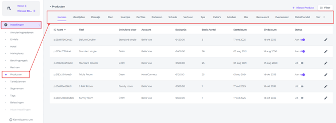 Producten (ook wel extra's of items genoemd) zijn aangemaakt tijdens de inrichting van je account voor het hotel. Navigeer naar Instellingen > Producten om deze te beheren:
