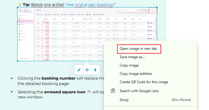 Beweeg je cursor eenvoudig over het boekingsnummer ergens in het systeem. Als je erop klikt, wordt direct de boekingspagina geopend.