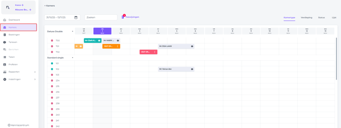Als er een kamernummer wordt weergegeven, geeft dit de toegewezen kamer voor de boeking aan. als er geen kamernummer wordt weergegeven moet je er een toewijzen. - Kamer Toevoegen