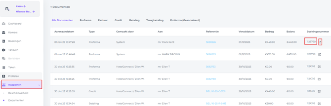 In verschillende functionaliteiten van het systeem kan je ook boekingen openen, bijvoorbeeld in het rapport 'Documenten':