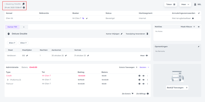 Het unieke boekingsnummer van het systeem, dat je kunt kopiëren en plakken waar nodig in het systeem om deze specifieke boeking te vinden of ernaar te verwijzen. - Datum en tijd van aanmaak