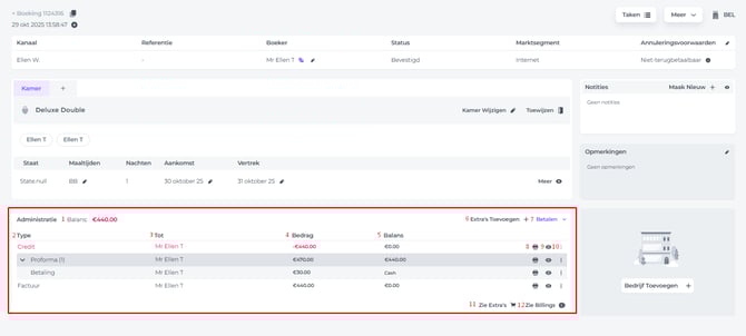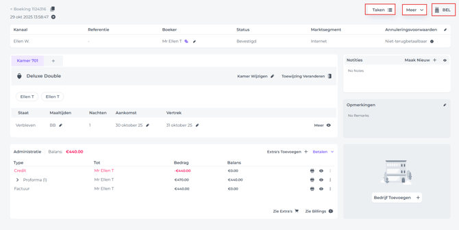 Zodra je de boekingspagina opent, zie je een centraal dashboard met alle belangrijke boekings- en gastgegevens. Je kunt eenvoudig informatie bekijken of bijwerken, activiteitengeschiedenis inzien, in- en uitchecken beheren, e-mailbevestigingen versturen en kamers toewijzen of wijzigen. Het financiële overzicht biedt een snel overzicht van de betalingsstatus, transactiegeschiedenis en opties om betalingslinks te versturen of het saldo te vereffenen, zodat je elke stap van de boekingscyclus vanuit één plek kunt beheren.
