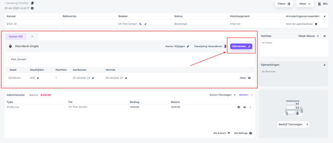 - De knop Uitchecken wordt zichtbaar op de vertrekdag. Als een boeking aan het einde van die dag niet is uitgecheckt, blijft de status 'Uitchecken'.