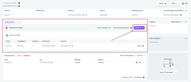 - De knop Check in verschijnt alleen op de dag van aankomst of, als de boeking is gemarkeerd als No Show, op de volgende dag en alleen als de kamer is toegewezen en schoon is.