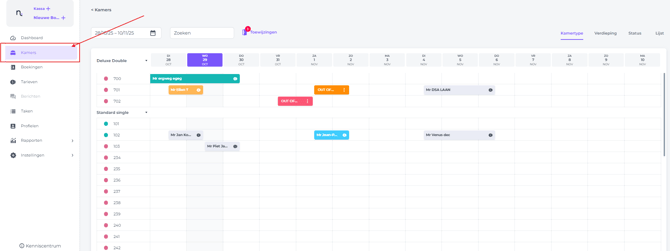 De Kamers Kalender is een onmisbaar hulpmiddel voor het dagelijkse hotelbeheer en biedt in één oogopslag een helder, realtime overzicht van alle reserveringen binnen de gekozen periode. Hier ziet je alle aankomsten, vertrekken en zowel toekomstige als eerdere verblijven. In dit artikel nemen we je stap voor stap mee door de mogelijkheden van de Kamers Kalender.