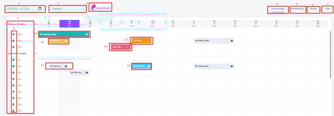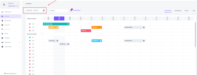 - Datumbereikbalk - Selecteer de periode waarvoor je reserveringen wilt bekijken.
