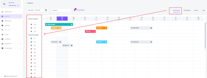 Wijs een kamer toe om ze in de kalenderweergave te laten zien. - Kamertypeweergave - De kamerskalender toont een kamerlijst geordend op kamertype: