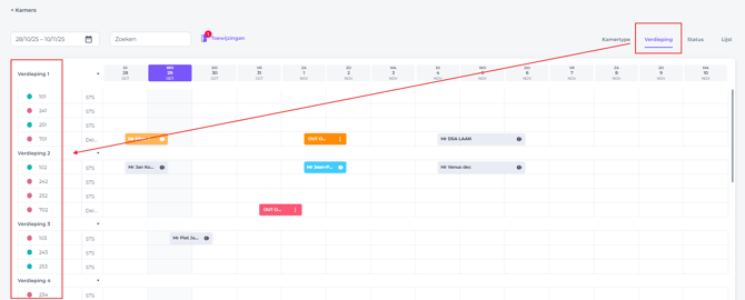 - Verdiepingsweergave - De kamerskalender toont een kamerlijst georganiseerd op kamertype: