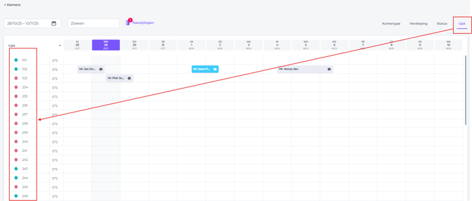 - Lijstweergave - De kamerskalender toont een lijst met kamers, georganiseerd op kamernummer:
