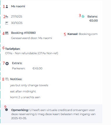 - Notities: de interne opmerkingen die aan deze specifieke reservering zijn toegevoegd.