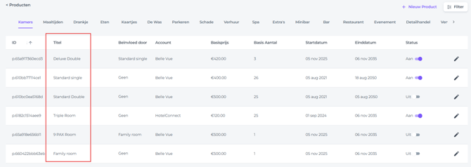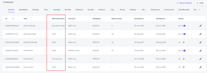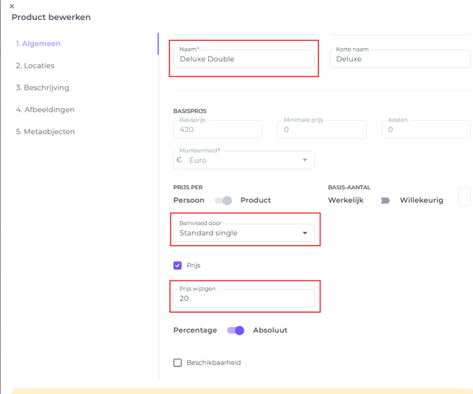 In de onderstaande schermafbeelding zie je dat de Deluxe Tweepersoonskamer wordt beïnvloedt door de Standaard Eenpersoonskamer met €20. Dus als de Standaard Eenpersoonskamer is ingesteld op € 400, wordt de Tweepersoonskamer automatisch € 420. In principe kan dit voor elk product worden gedaan: