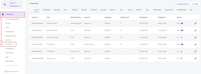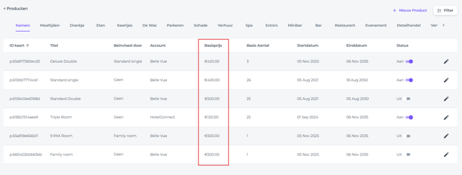 Voor kamers wordt aanbevolen om de basisprijs hoog in te stellen, aangezien de nachtprijzen handmatig worden bepaald en beheerd via de tarievenkalender. Deze hogere basisprijs dient als bescherming en zorgt ervoor dat kamers niet tegen onverwacht lage prijzen worden aangeboden als de nachtprijzen nog niet in de tariefkalender zijn ingesteld/aangepast: