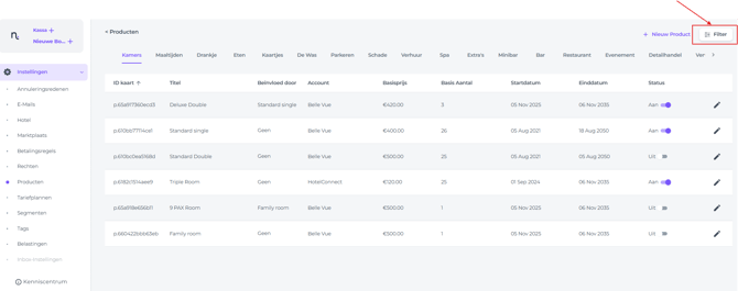 - Klik op de knop Filter om de productlijst te verfijnen: