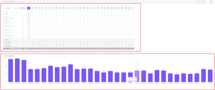 In het rapport zie je de werkelijke beschikbaarheid (nog te verkopen kamers) in een tabel en de werkelijke bezetting per dag (verkochte kamers) in een grafiek voor een duidelijker beeld.