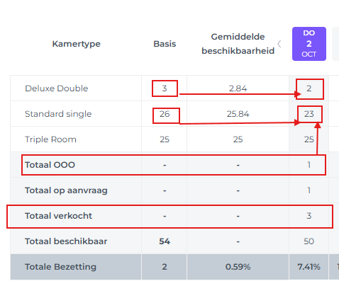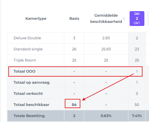 Kamers die als 'OOO' zijn ingesteld (Out Of Order/Buiten Gebruik), worden uit de inventaris gehaald. Daardoor zullen de totale beschikbare basiskamers minder zijn, zoals in dit voorbeeld waar van de 55 kamers een kamer OOO is gezet.: