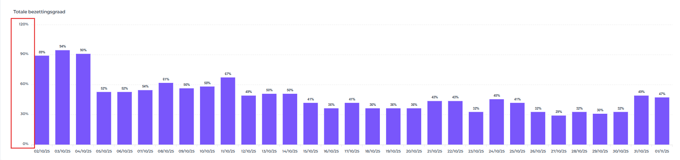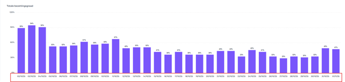 Het bezettingspercentage per datum wordt boven elke balk weergegeven: