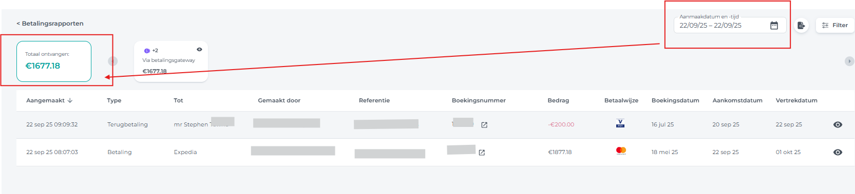 Linksboven op de pagina 'Betalingsrapport' zie je het totaal van de ontvangen betalingen voor de geselecteerde periode.