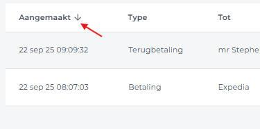 Je kunt de sorteervolgorde van de aanmaakdatum wijzigen binnen de periode die jehebt geselecteerd in het datumbereik van het betaalrapport.