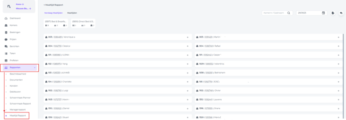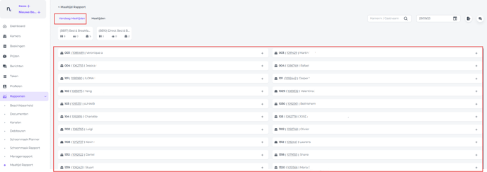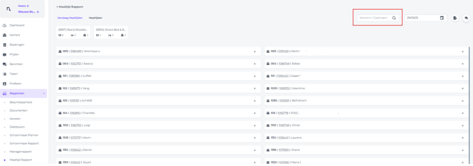 Je kunt in de zoekbalk rechtsboven in jouw scherm zoeken naar slechts één kamernummer of één gast per naam: